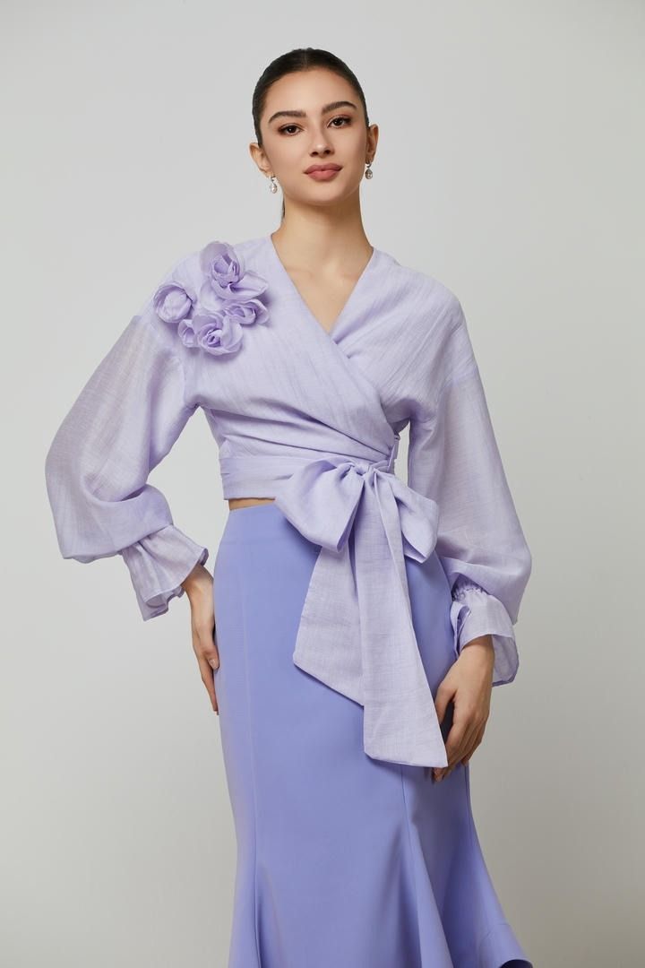بلوزة ملفوفة من الأورجانزا الكتانية بلون الليلك، بتصميم أنثوي أنيق يتميز بياقة على شكل V وأكمام طويلة تنتهي بكشكش جذاب. مزينة بزهور ثلاثية الأبعاد عند الكتف، وتلتف حول الجسم لتُربط بقوس كبير عند الحافة لإطلالة راقية وجذابة.