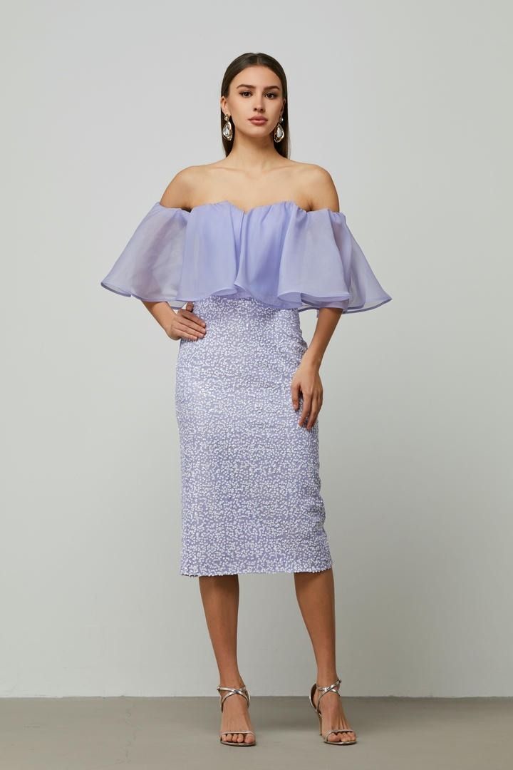 تنورة ميدي بخصر عالٍ مزينة بالترتر البنفسجي اللامع، تمنحك إطلالة راقية وحيوية. بتصميم أنيق وانسيابي، مزودة بسحاب في منتصف الظهر لضمان ملاءمة مثالية. يمكن تنسيقها مع توب من نفس المجموعة لإطلالة ساحرة ومتكاملة.