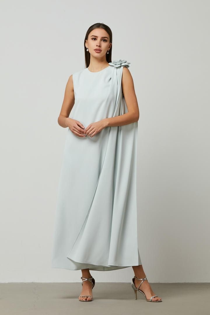 فستان أنيق من الكريب بتصميم وشاح مميز وأكمام غير متماثلة. يتميز بياقة دائرية وانسيابية رائعة، مع زخرفة زهرية راقية على الكتف تضيف لمسة أنثوية جذابة. مزيج مثالي من الرقي والبساطة.