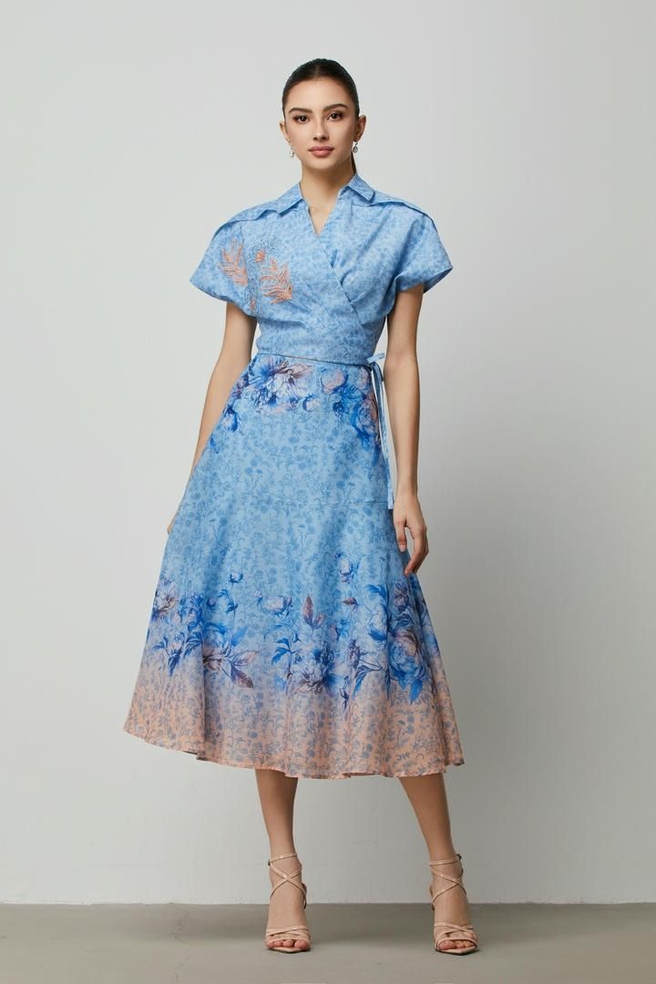 تنورة متوسطة الطول بتصميم أنيق مع تفصيل على أرداف وطباعة مميزة. يمكن تنسيقها مع بلوزة متناسقة من المجموعة لإطلالة راقية.