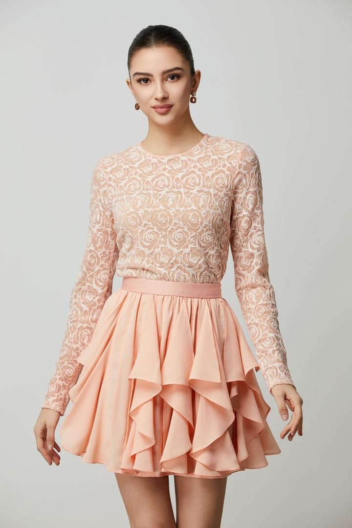 أضفي لمسة من الأنوثة إلى إطلالتك مع هذه التنورة المتموجة الأنيقة. تتميز بحزام من الستان لإطلالة أنيقة، وإدراج من الشيفون المموج لحركة خفيفة، وطول قصير لإطلالة مرحة وعصرية. مثالية للمناسبات اليومية أو الفخمة.