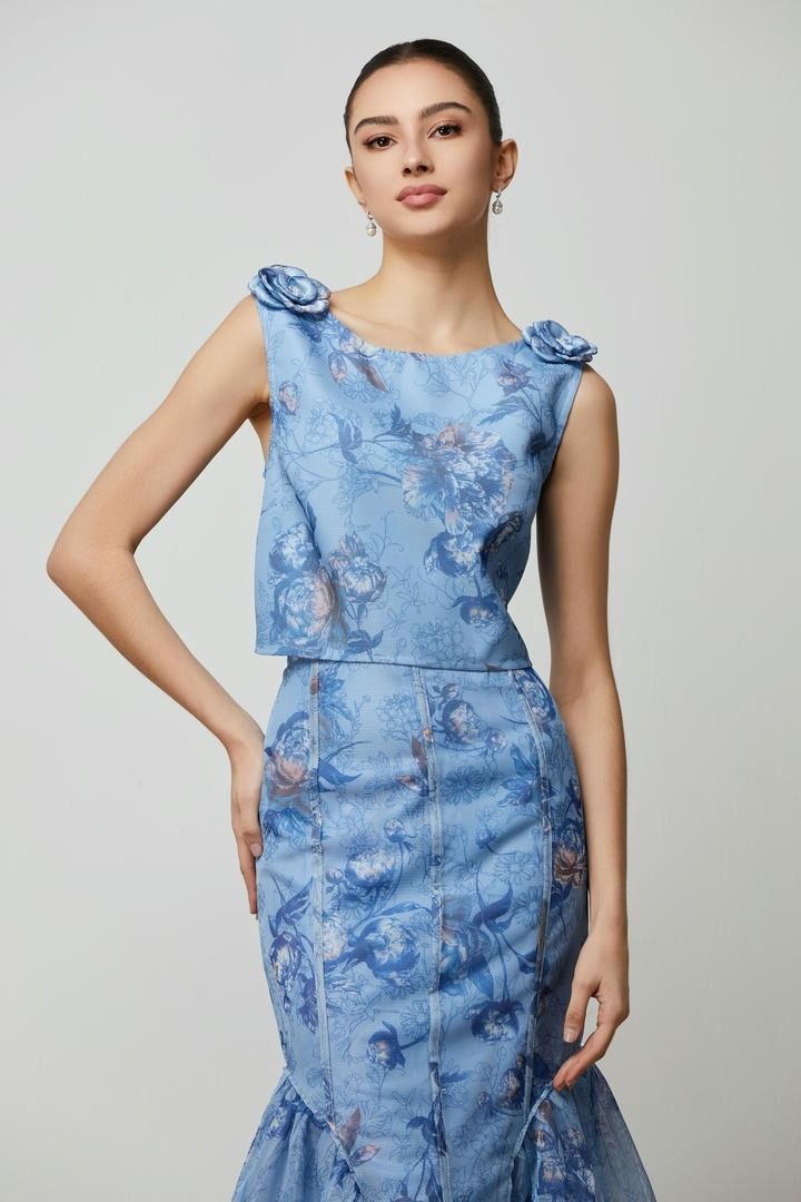 توب كروب أنيق بتصميم ملفت يتميز بياقة القارب وتطريز وردي فاخر في الأمام. مزين بنقشة شاملة ليمنحك لمسة عصرية، ويمكن تنسيقه مع تنورة متطابقة من المجموعة.