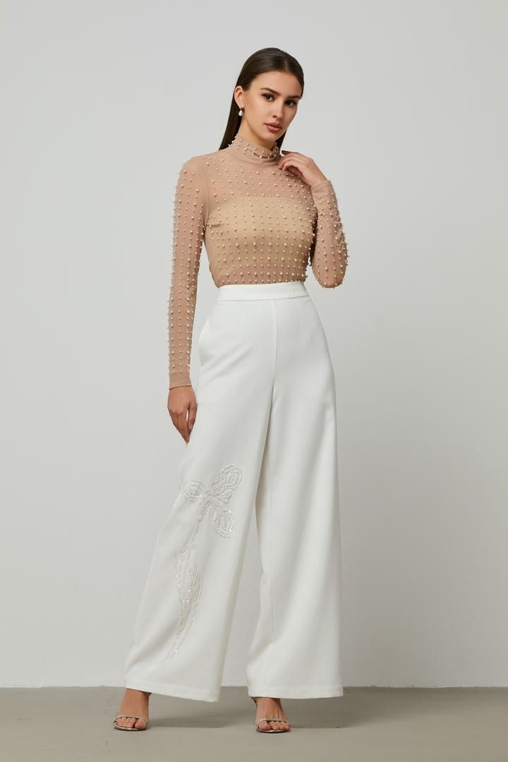 ارتقِ بإطلالتك مع هذا البنطال عالي الخصر بقصّة واسعة وتطريزات أنيقة تضفي لمسة فاخرة. مزود بجيوب جانبية وسحاب غير مرئي لإطلالة متناسقة. يمكن تنسيقه مع توب من المجموعة لإطلالة متكاملة.