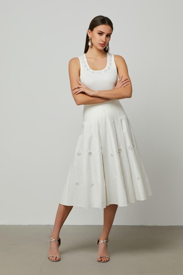 تجمع هذه التنورة الأنيقة بين الطراز والراحة بطولها المتوسط وإغلاق السحاب الجانبي. مزينة بزخارف خرزيه تضفي لمسة من الأناقة. يمكن تنسيقها مع بلوزة من نفس القماش لإطلالة متناسقة.
