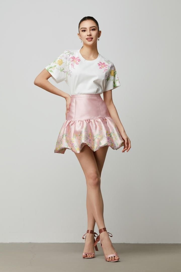تتميز هذه التنورة القصيرة ذات الخصر العالي بطباعة مميزة وتصميم بطرف بالوني جذاب، مما يجعلها قطعة ملفتة. مثالية لإضافة لمسة مرحة وعصرية إلى إطلالتك.