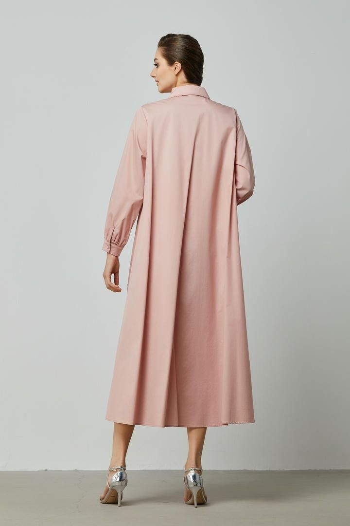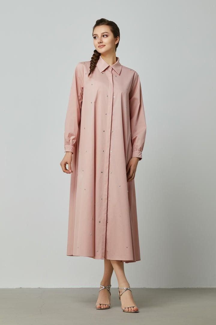 هذا قفطان الأنيق يتميز بياقة قميص وأكمام طويلة وقصة على شكل حرف A، مع تفاصيل من الأحجار اللامعة على الجزء الأمامي.
