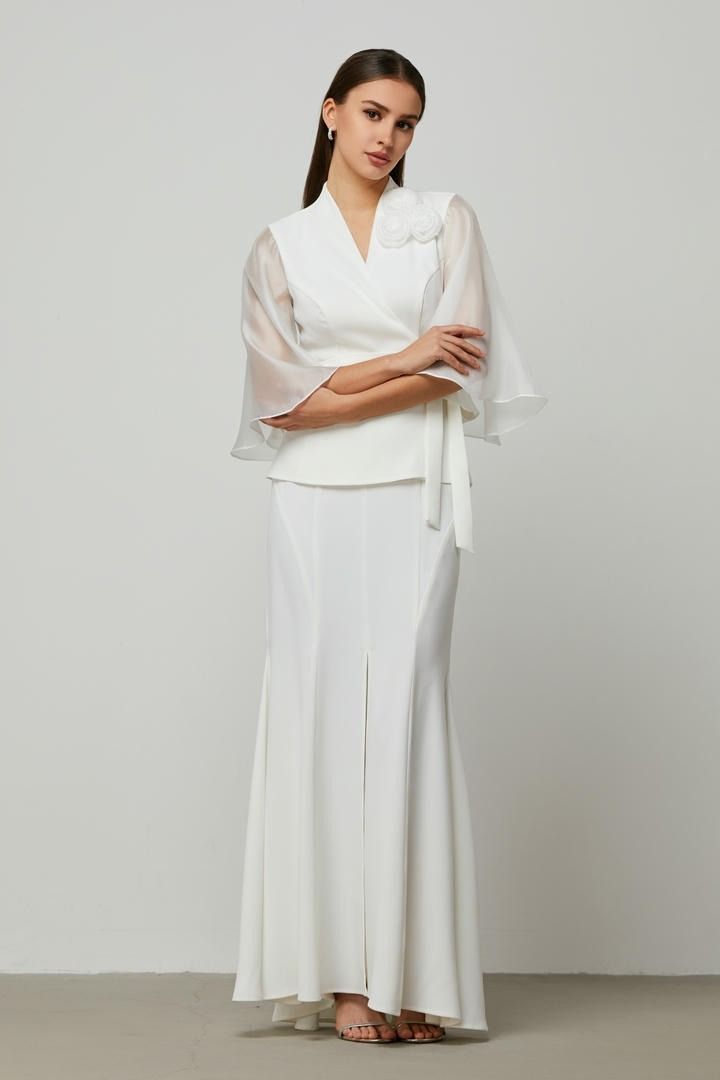 تنورة طويلة بتصميم حورية البحر، مع شق أمامي وسحاب جانبي مخفي. يمكن تنسيقها مع البلوزة المطابقة لإطلالة أنيقة ومتكاملة.