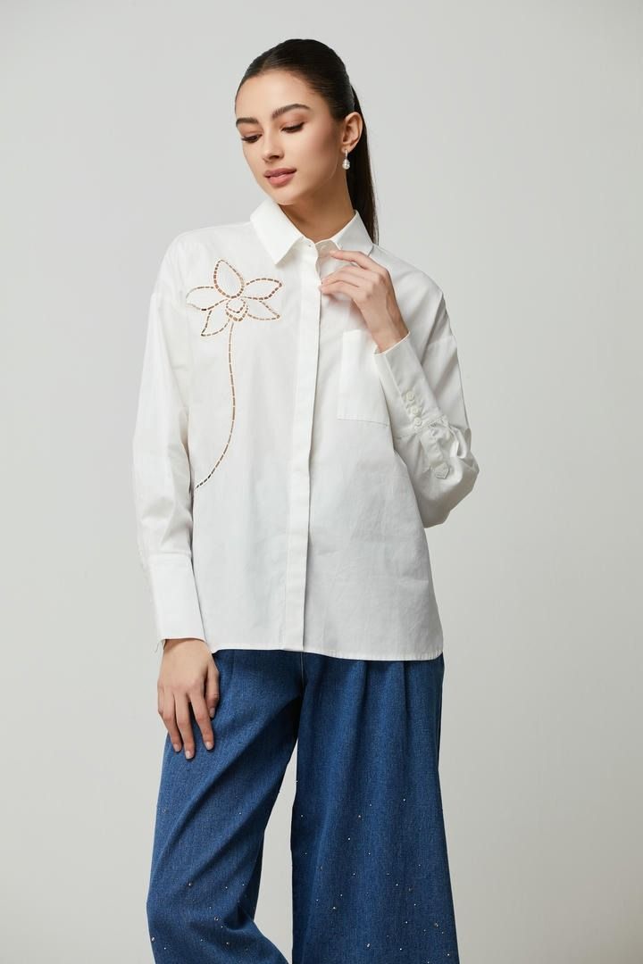قميص أنيق مصنوع من قطن بوبلين أبيض بتصميم عصري راقٍ. يتميز بياقة كلاسيكية، وأكمام طويلة بأساور، وتفاصيل قصّات مزخرفة في الأمام، مما يضفي لمسة جريئة ومتقنة على إطلالتك.