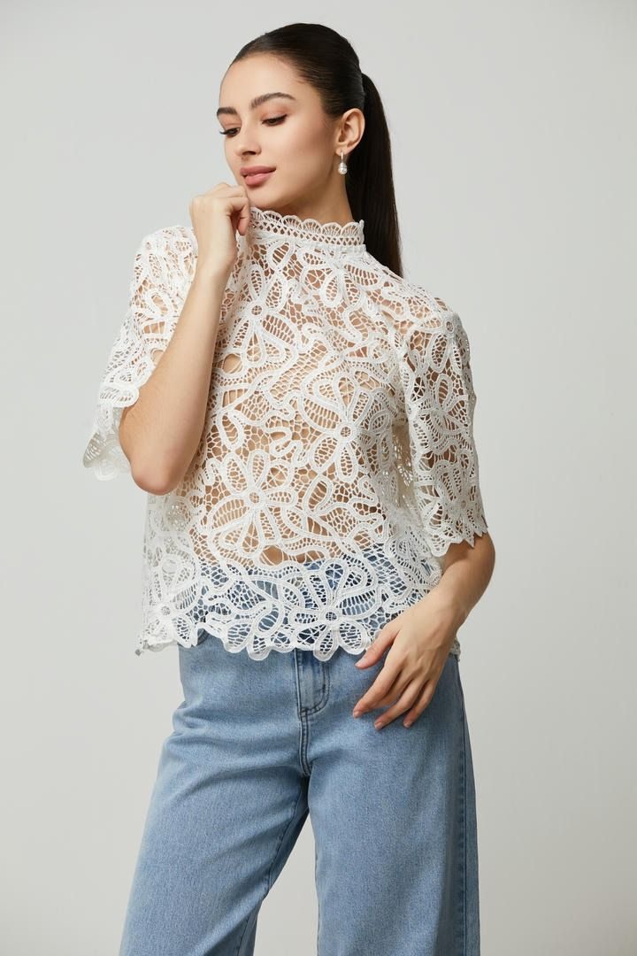 بلوزة دانتيل راقية برقبة عالية وأكمام قصيرة، مزينة بنقشة دانتيل فريدة. مثالية لإطلالة أنيقة وعصرية.
