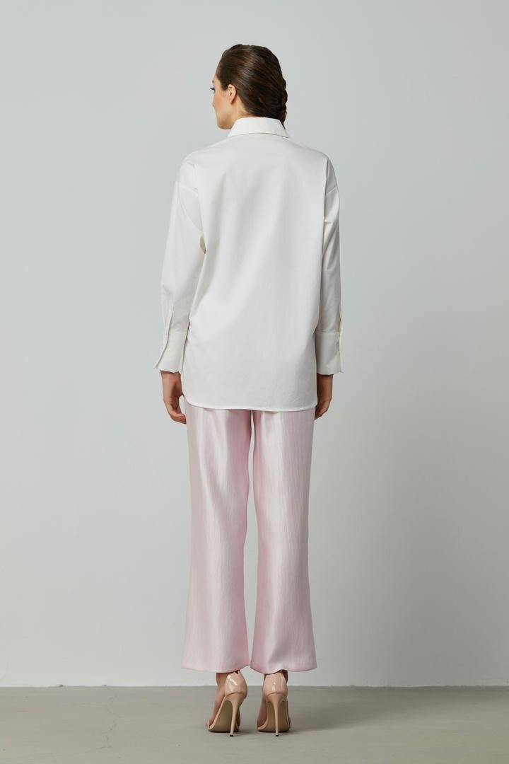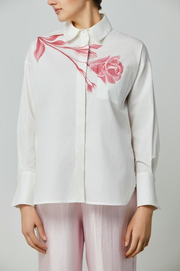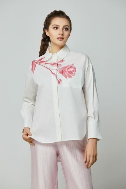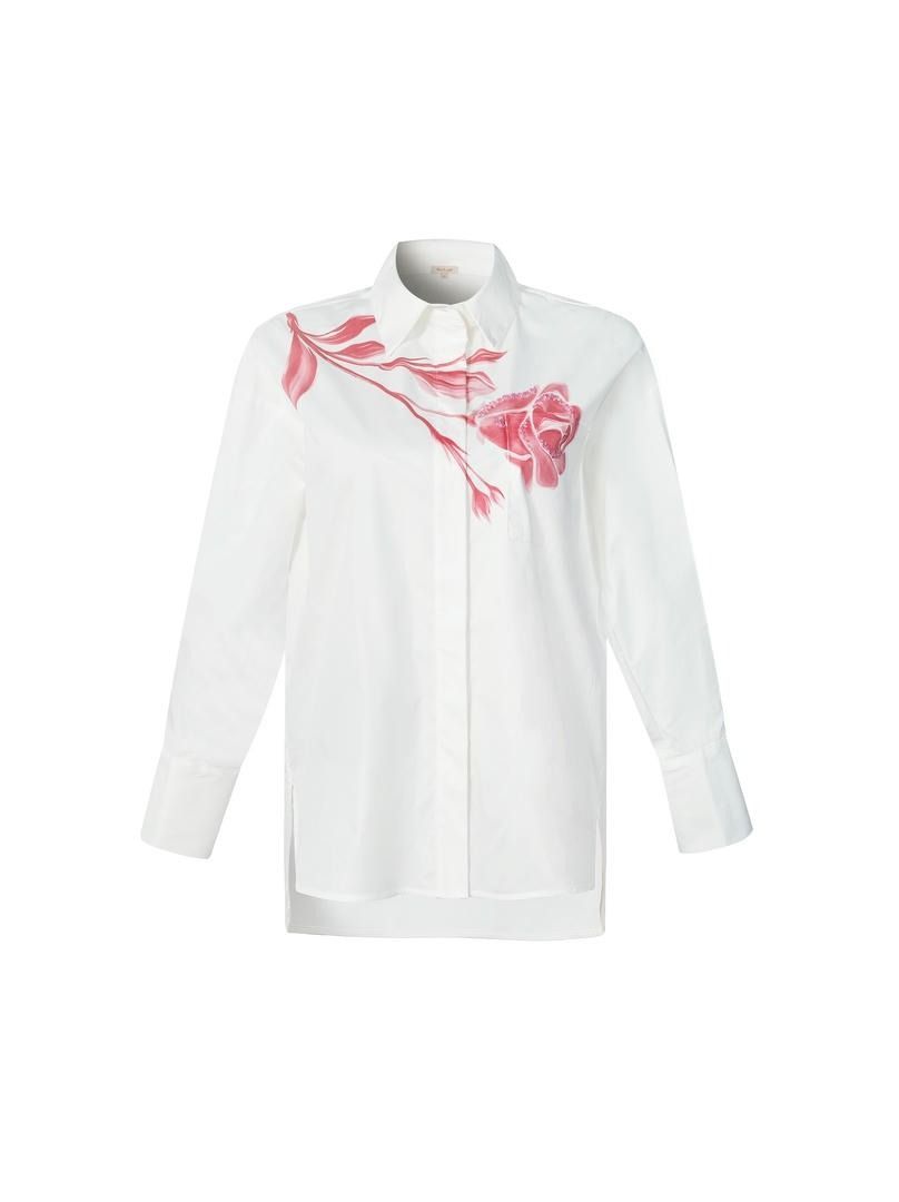 قميص من قماش القطن بوبلين مع طباعة زهور مميزة، جيب أمامي، أكمام طويلة مزخرفة بأساور،مخفي بأزرار لواجهة أنيقة.