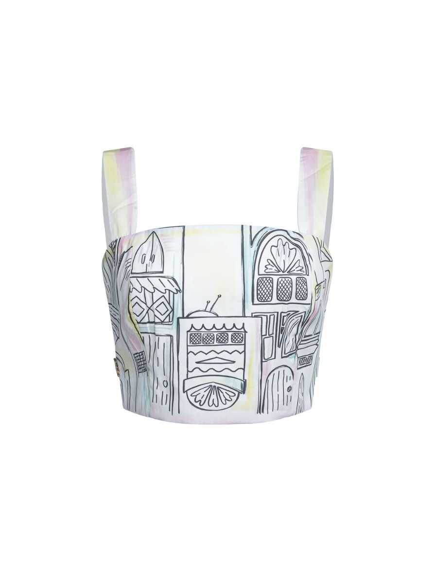 ارتقي بإطلالتك مع هذا التوب القصير الأنيق، المصمم بأشرطة رفيعة، وقصة ضيقة تبرز القوام، مع طبعة مدينة جذابة. يتميز الظهر بتفصيل السموك لإضفاء راحة مثالية. نسّقيه مع تنورة من نفس المجموعة لإطلالة متناسقة.