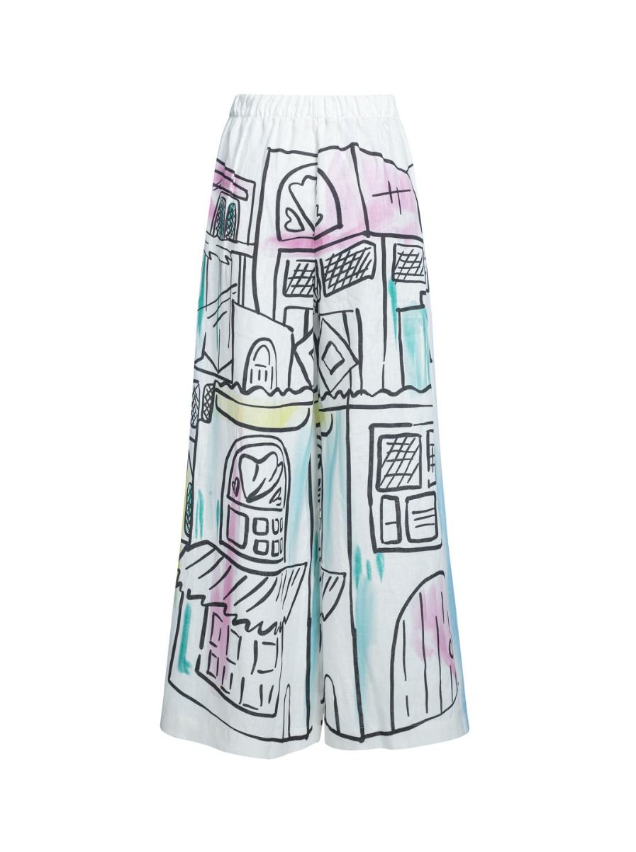 يتميز هذا البنطال المصنوع من الكتان بخصر مطاطي لملاءمة مثالية، مع طبعة مدينة جذابة. بقصّة مستقيمة تمنحه لمسة كلاسيكية، ما يجعله خيارًا مثالياً للتنسيق مع بلوزة من المجموعة.