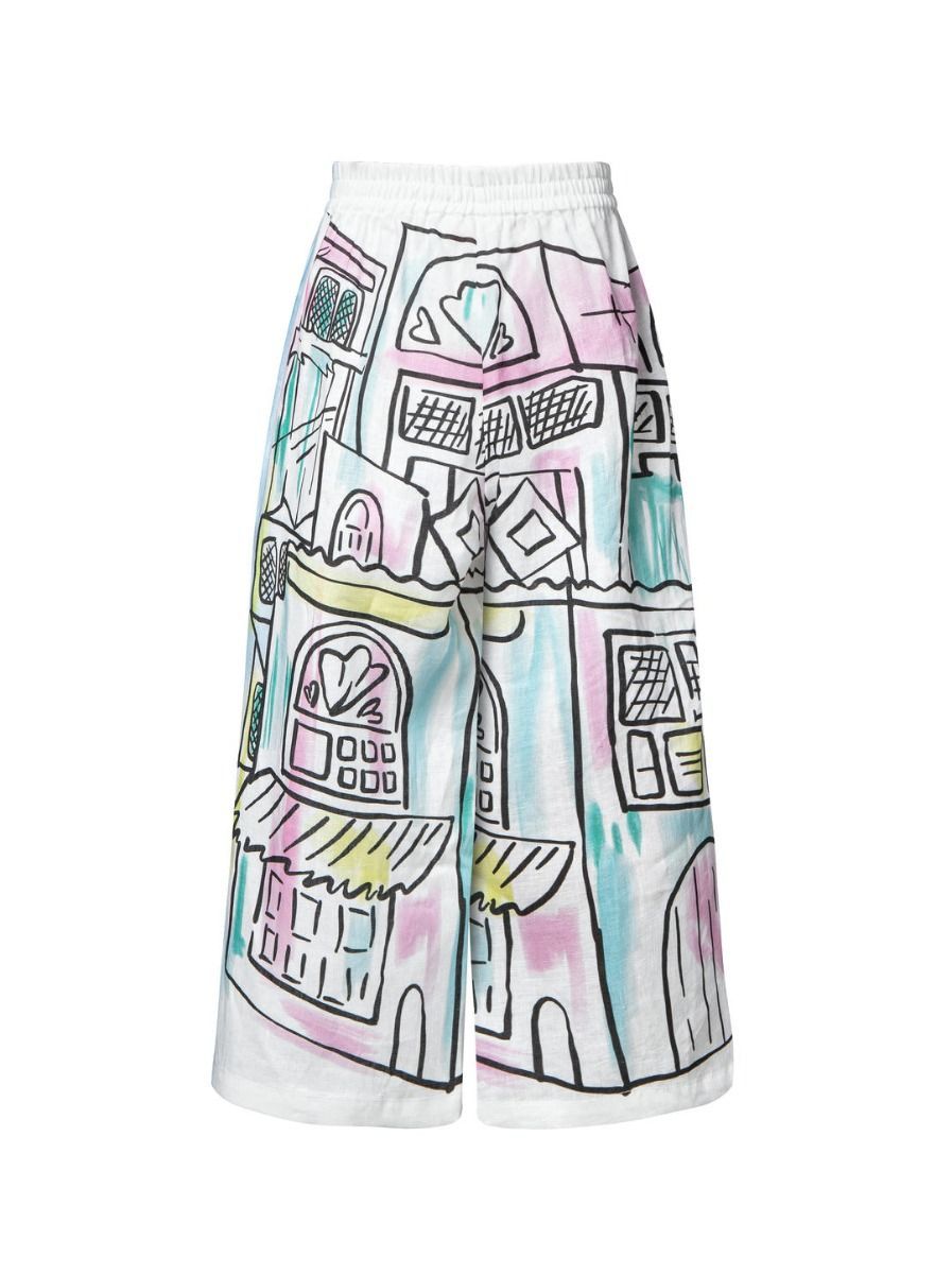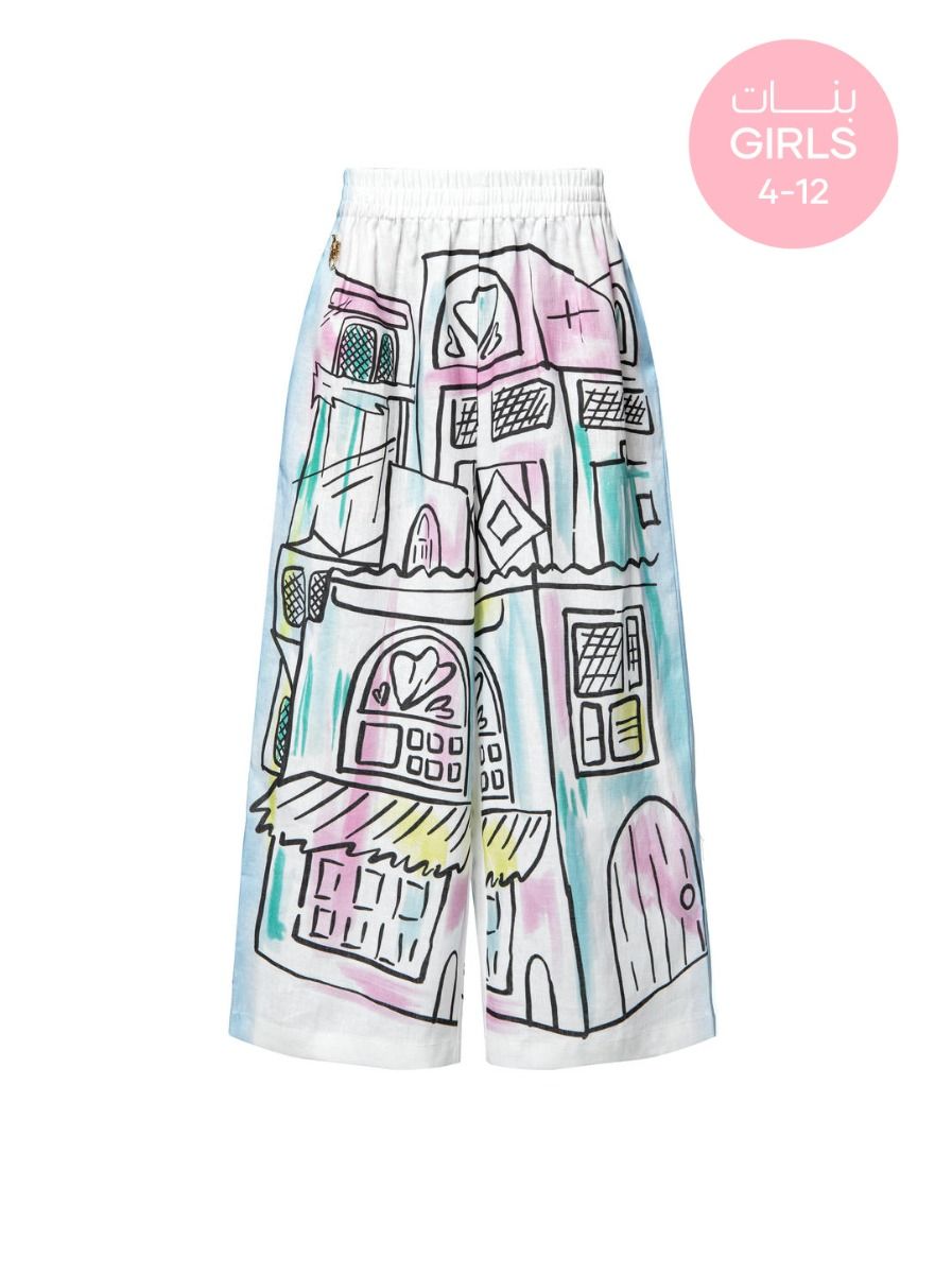 بنطال أنيق بقصة قصيرة، مزين بطبعات فنية مميزة، مع خصر مطاطي من نفس القماش لراحة مثالية. يمكن تنسيقه بسهولة مع بلوزة من نفس المجموعة