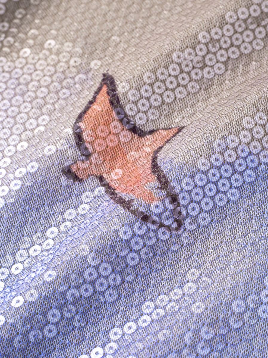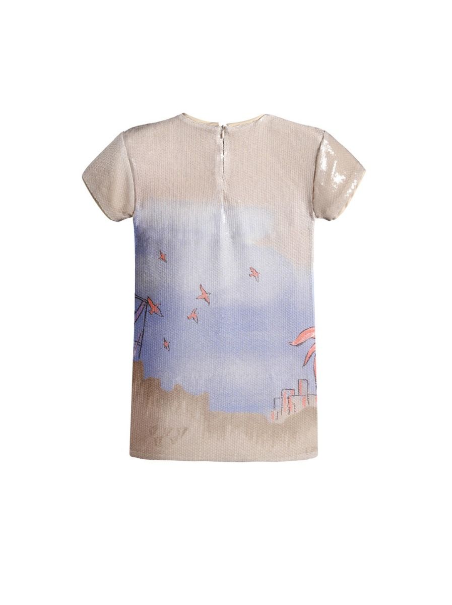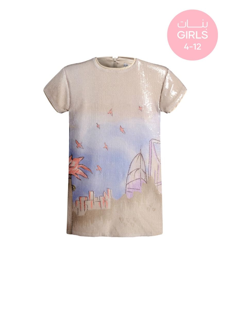 تتألق هذه الفستان الميدي للبنات بتصميم مزين بالكامل بالطباعة والترتر، مع فتحة عنق دائرية وأكمام قصيرة وقصة مريحة واسعة بسحاب في منتصف الظهر.