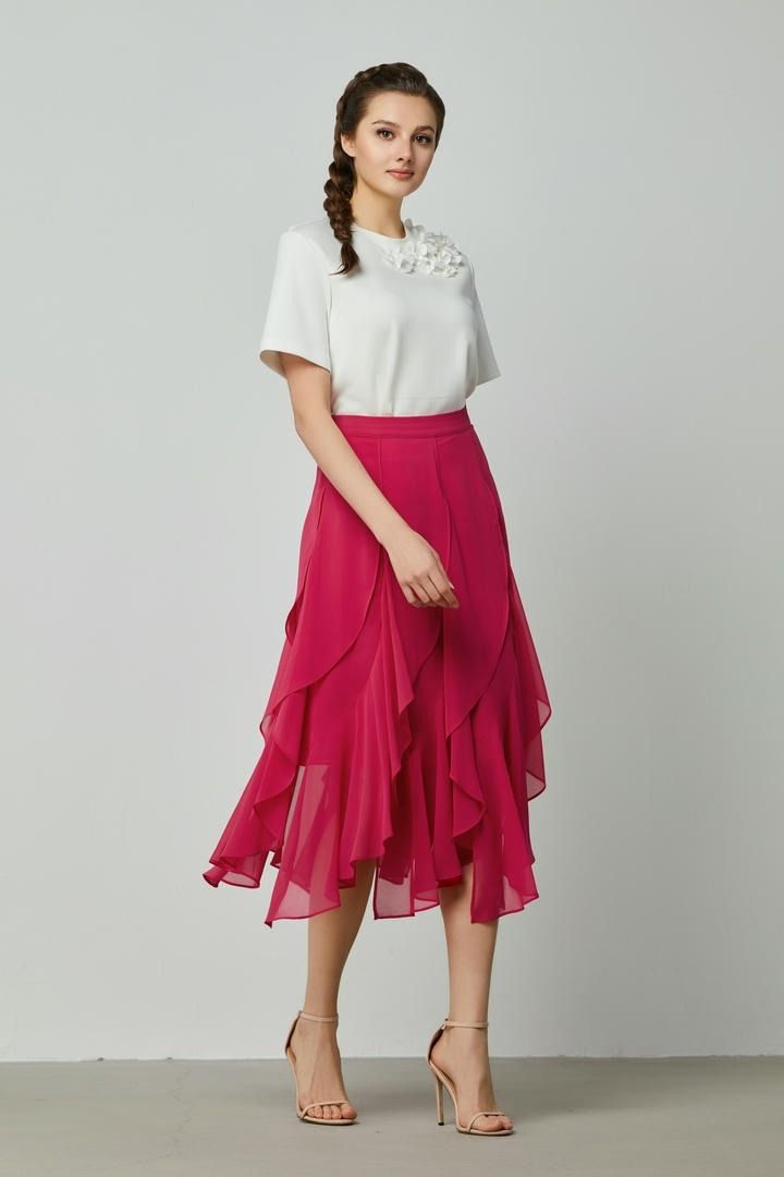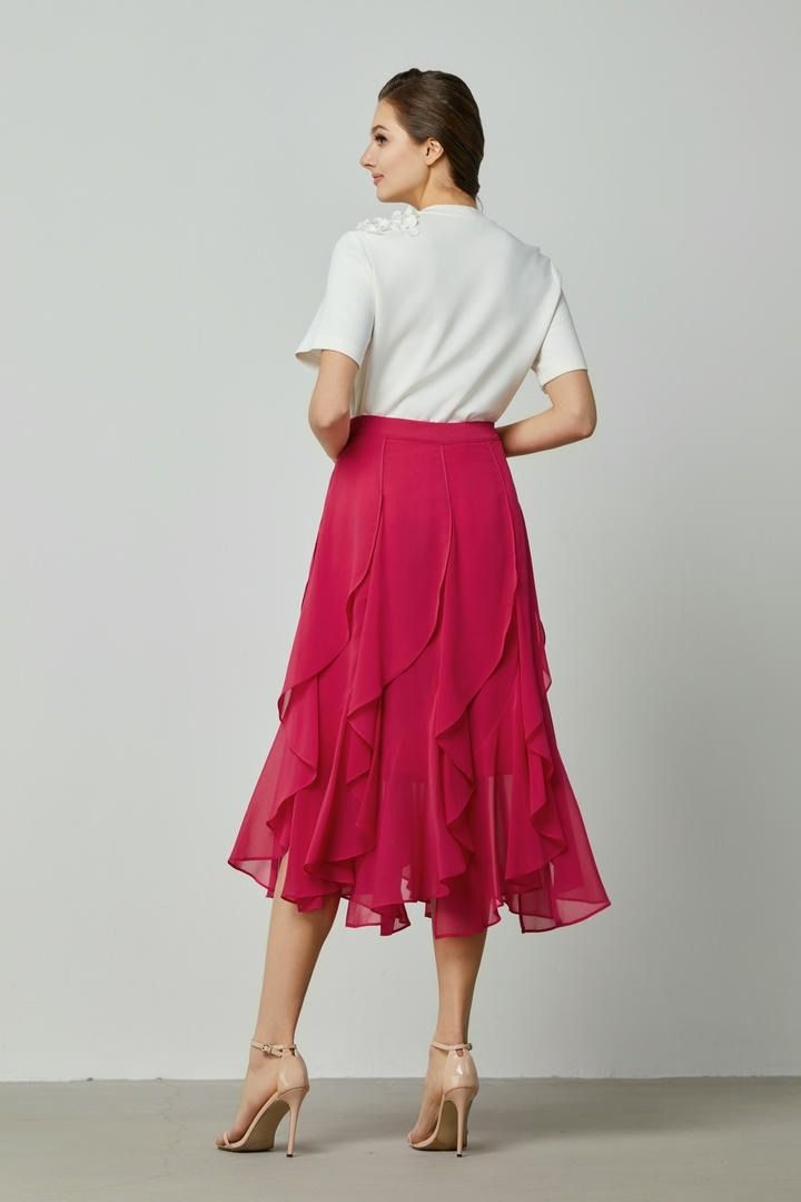 تتميز هذه التنورة بخصر مرتفع لملاءمة جذابة وهي مصنوعة من قماش شيفون ناعم. تتميز بحواف مكشكشه لإضفاء لمسة مرحة ولها سحاب جانبي غير مرئي لإطلالة ناعمة.