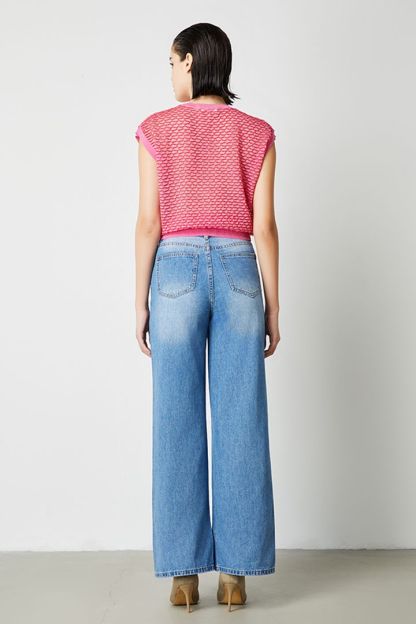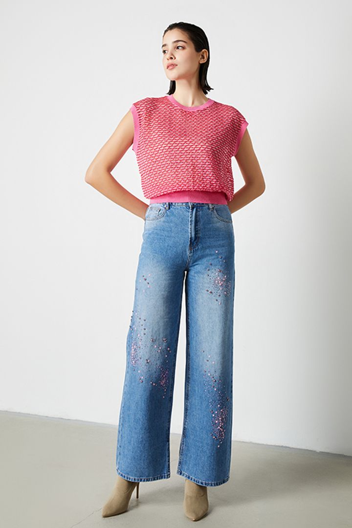 بنطلون جينز أنيق بخصر عالي وقصة مستقيمة. يتميز بتطريز مزين بأحجار الراين الملونة.