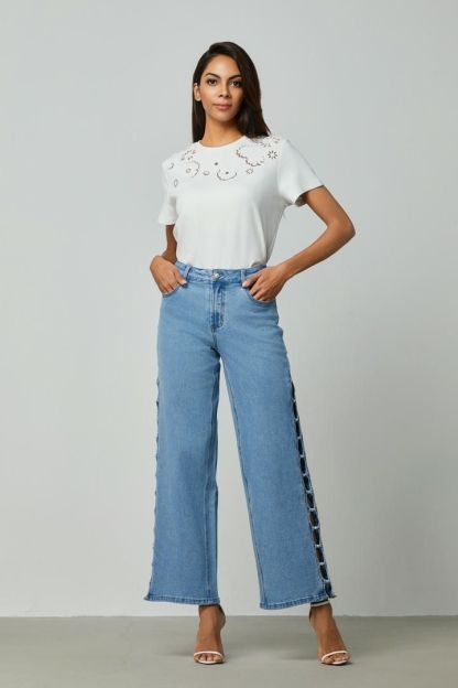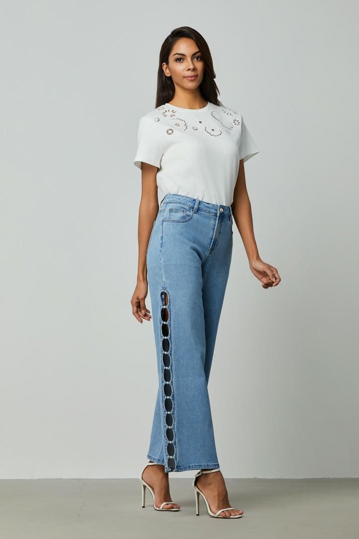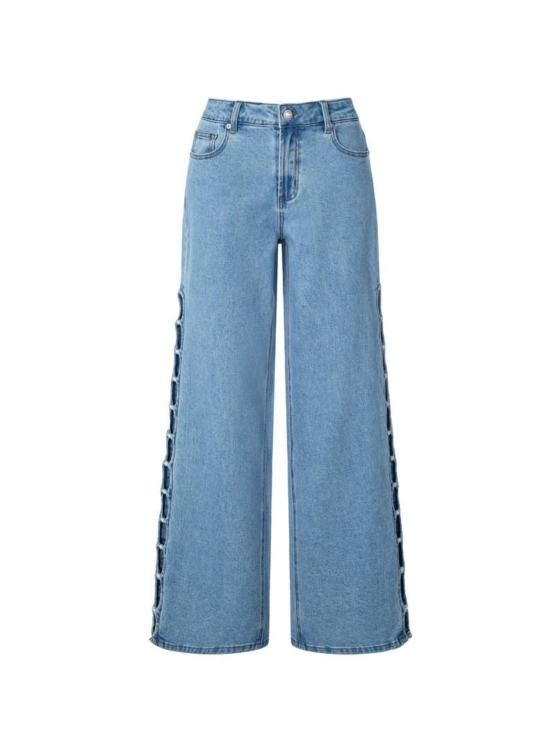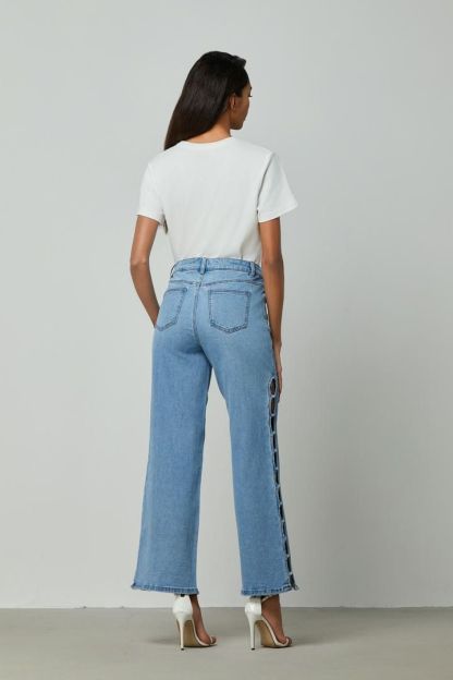 بنطلون جينز عصري بخصر عالٍ وتصميم كلاسيكي بخمسة جيوب، مثالي لإطلالة أنيقة ومريحة. يتميز بساقين مستقيمتين، مما يجعله سهل التنسيق مع مختلف الإطلالات. يحتوي على تفاصيل فريدة مثل اللآلئ والفتحات على الجوانب، مما يضفي لمسة ممتعة وعصرية.