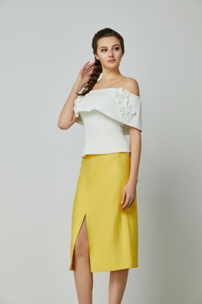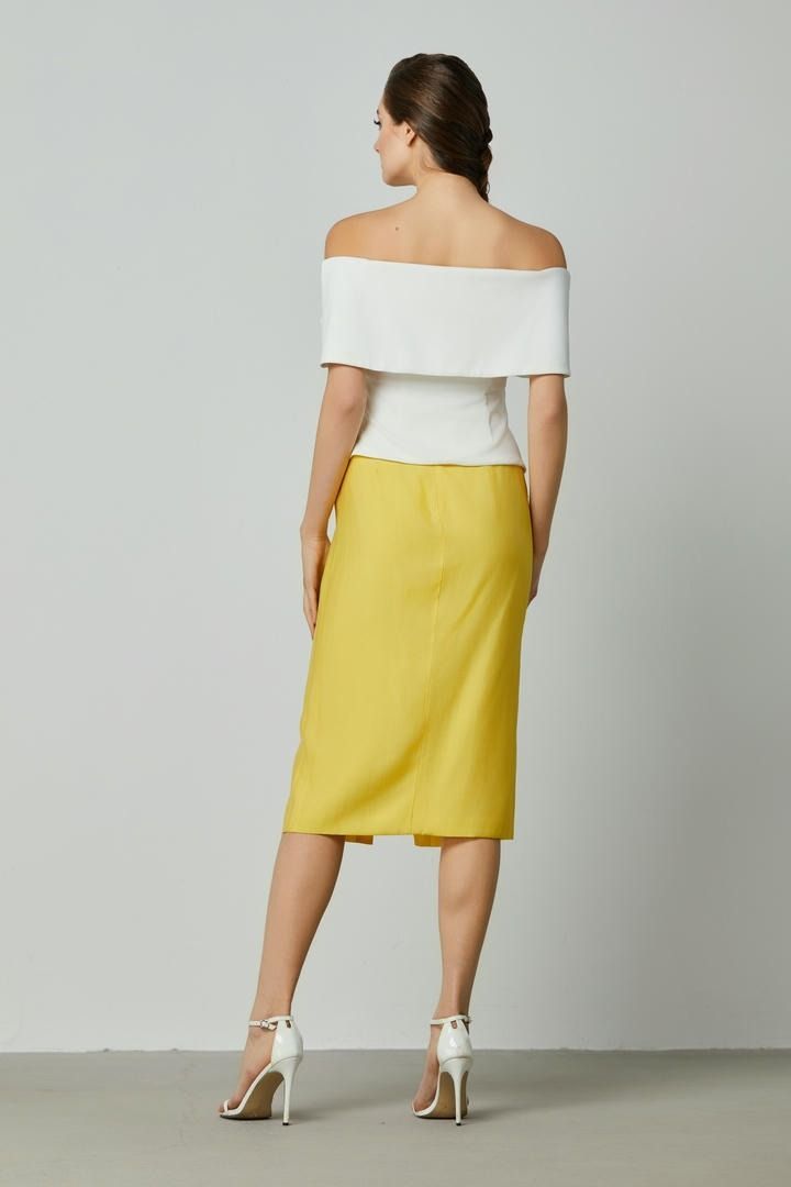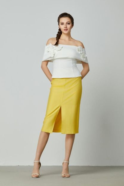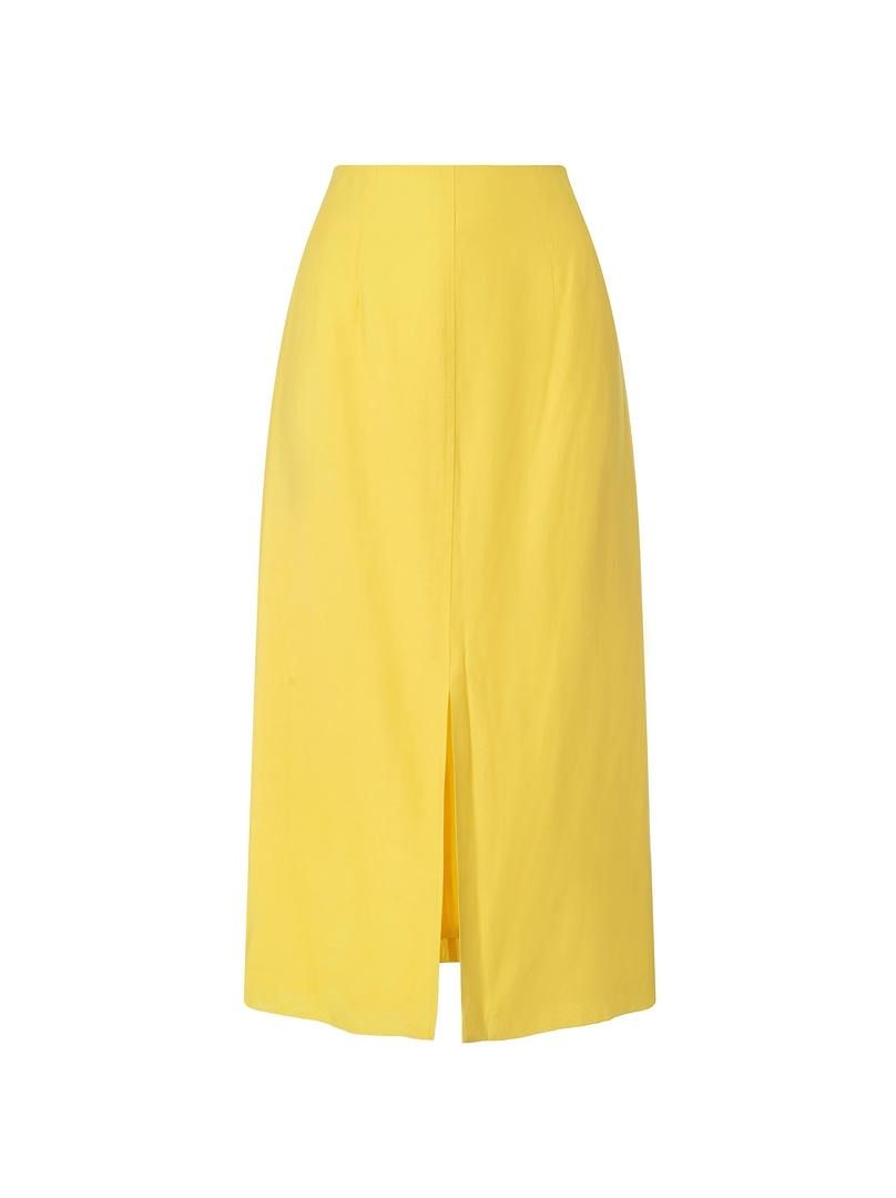 تنورة بقصّة قلم تتميز بتفاصيل خياطة جريئة في المنتصف الأمامي وفتحة شق دقيقة، وتضفي لمسة عصرية على التصميم الكلاسيكي. يضمن السحاب غير المرئي لمسة نهائية سلسة.