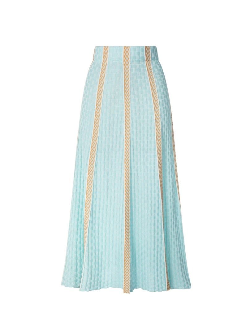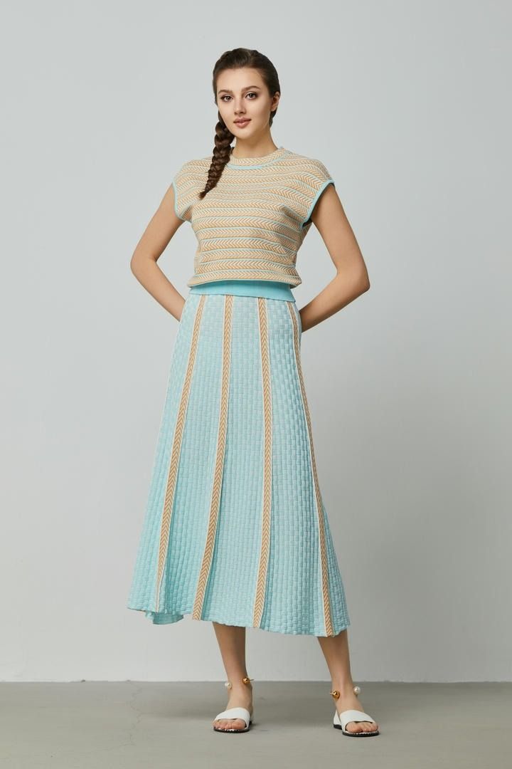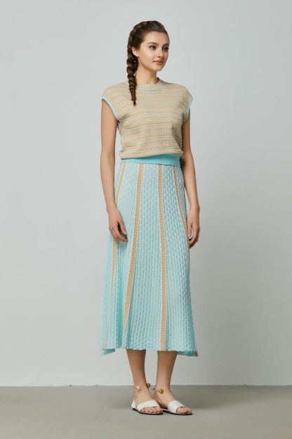 تنورة محبوكة ستضفين لمسة من الأناقة والألوان إلى إطلالتك. تتميز بخصر عالٍ مرن وتصميم مطاطي، مع خطوط بلون متدرج جذاب.