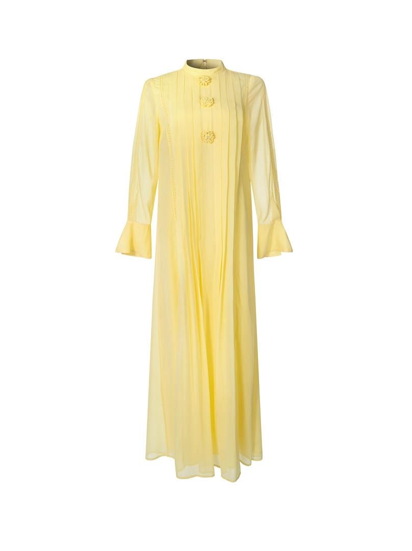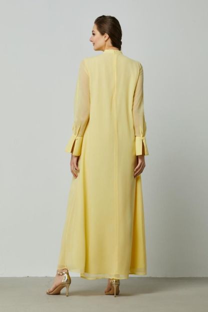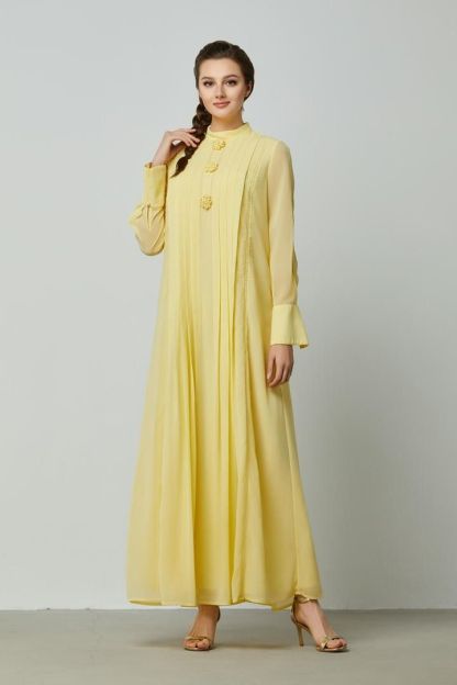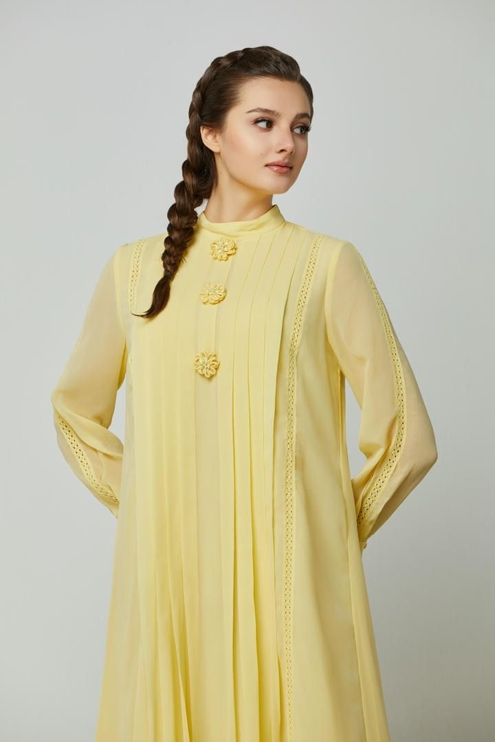 تمتعي بإطلالة أنيقة مع هذا القفطان الرائع، الذي يتميز بياقة واقفة أنيقة وفتحة مزينة بزخارف زهور ثلاثية الأبعاد. كما تعمل الثنيات وتفاصيل الحواف المعقدة على خلق مظهر انسيابي وبنيوي، بينما تضيف الأكمام الطويلة ذات الأطراف المطوية لمسة من الرقي.