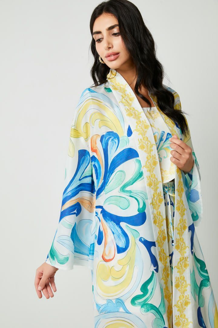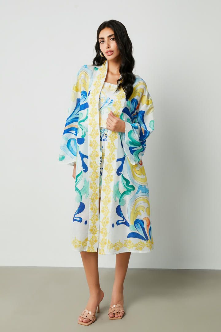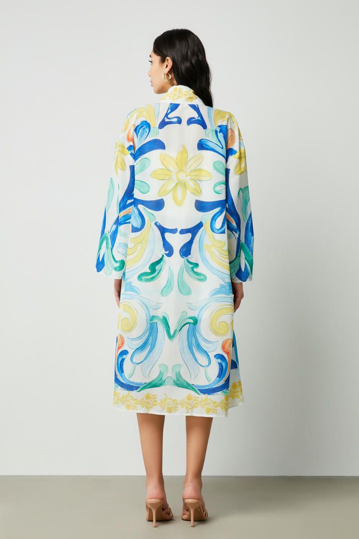 تم تصميم هذا الكارديجان بأكمام طويلة وواسعة وتتميز بطبقة خارجية من المطبوعات الفريدة