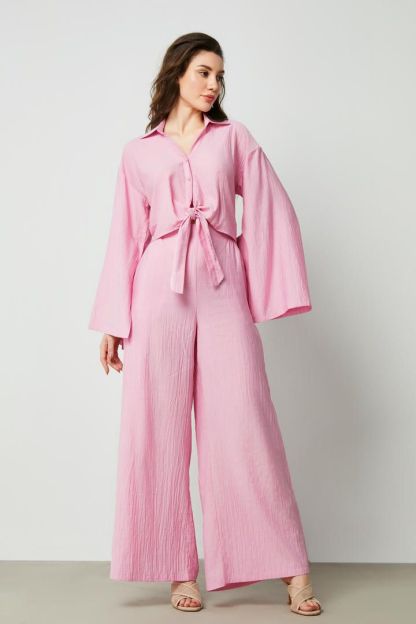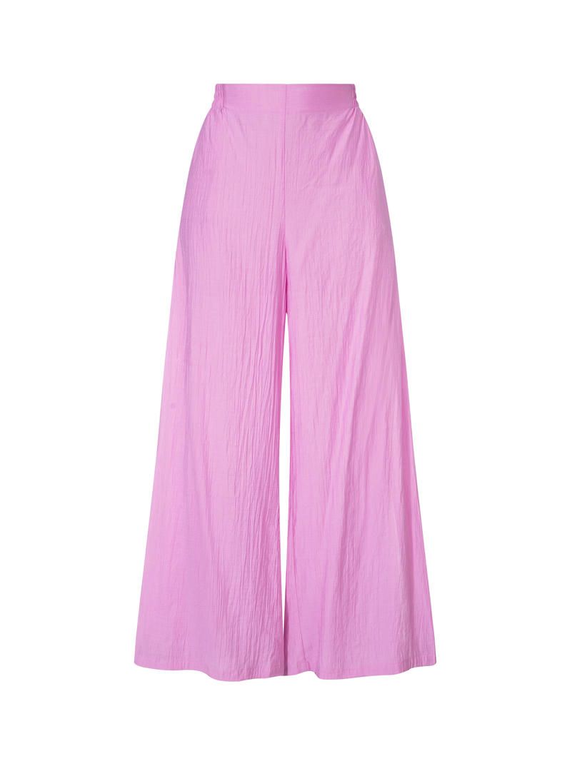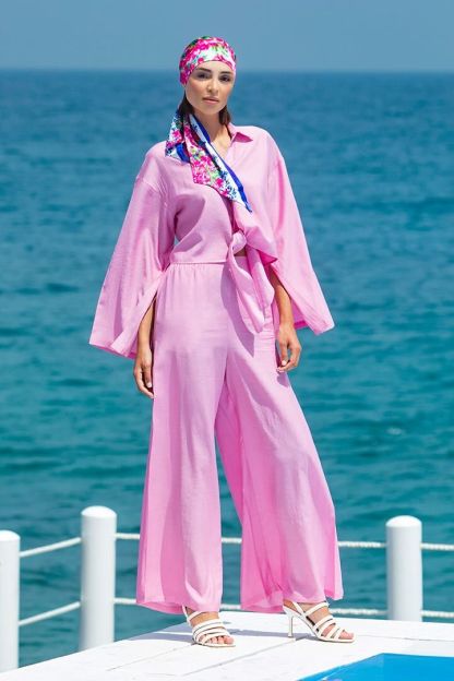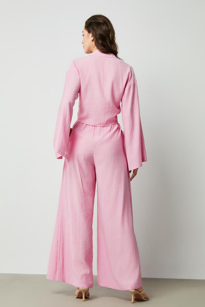 قصة واسعة وخصر مرتفع مع تفاصيل فتحات في الأمام. يمكن تنسيق هذا البنطلون مع بلوزة من نفس النمط.