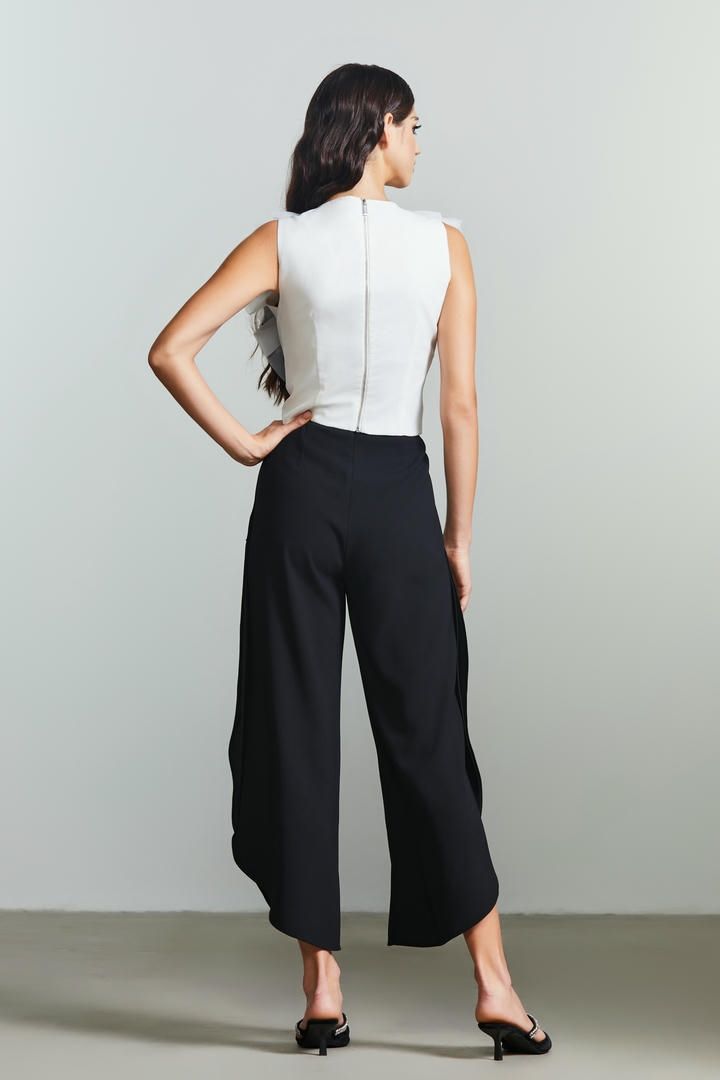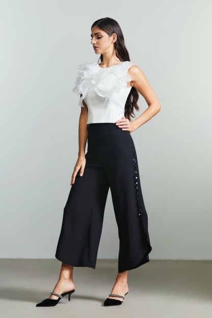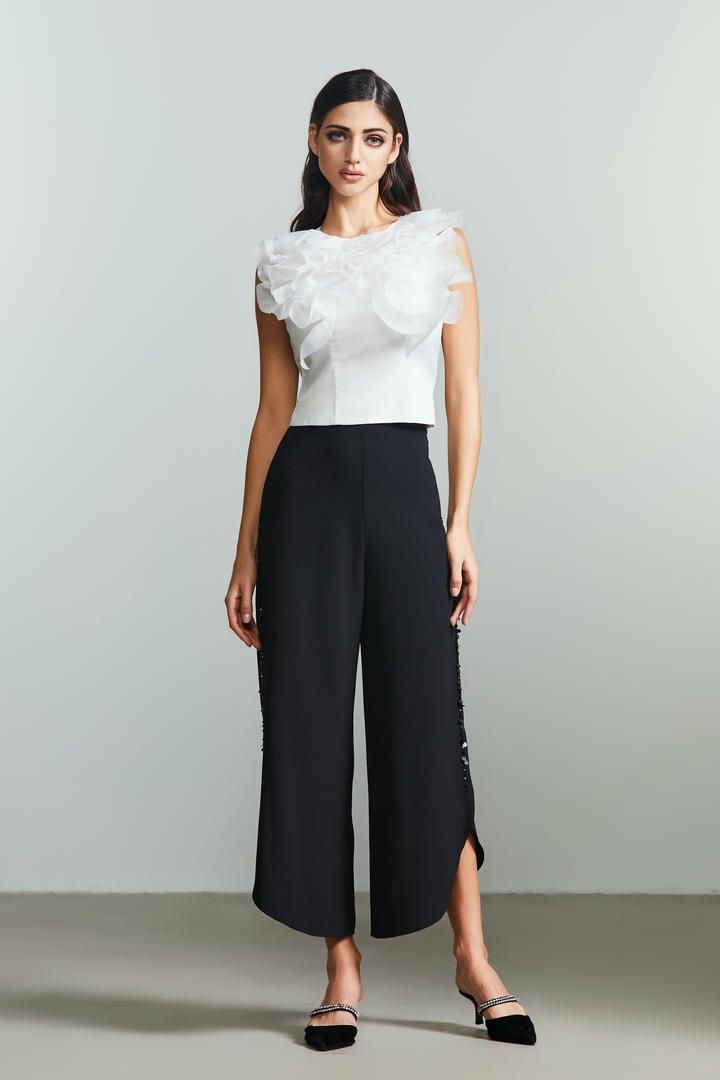 يتميز بتطريزات متناسقة على الجوانب تضيف لمسة أنيقة ومميزة. يقدم التصميم بقصة الخصر المنخفض مظهرًا عصريًا، بينما يعزز السحاب الخلفي الراحة.