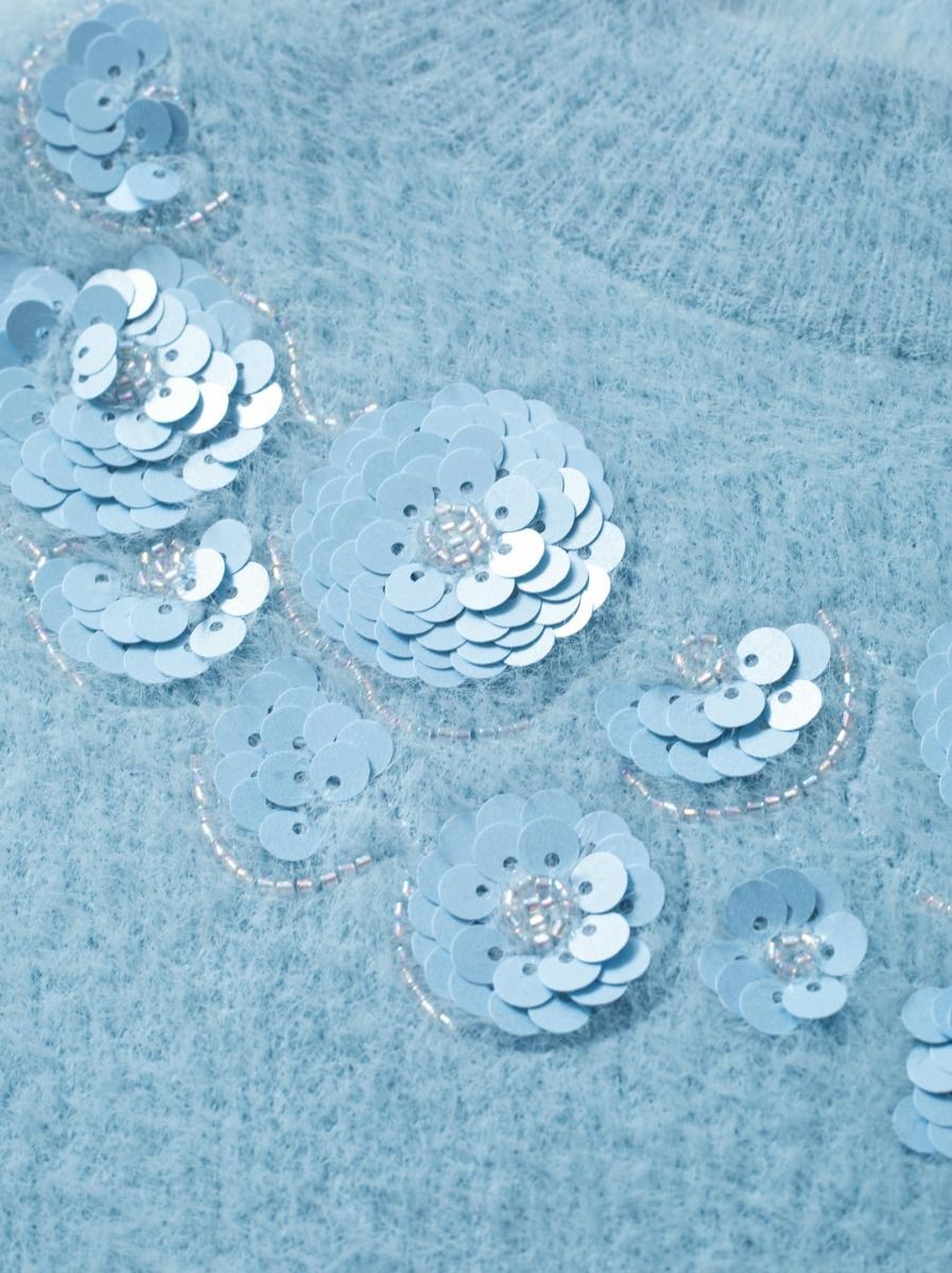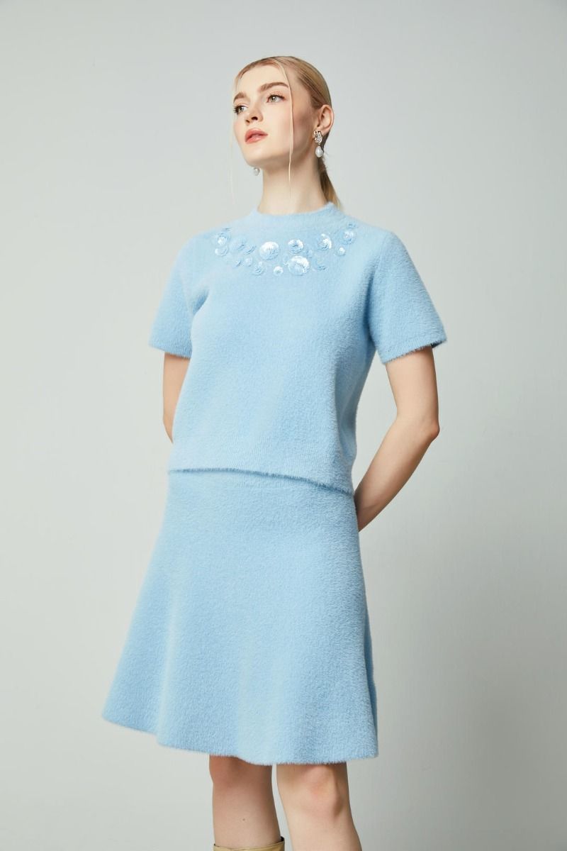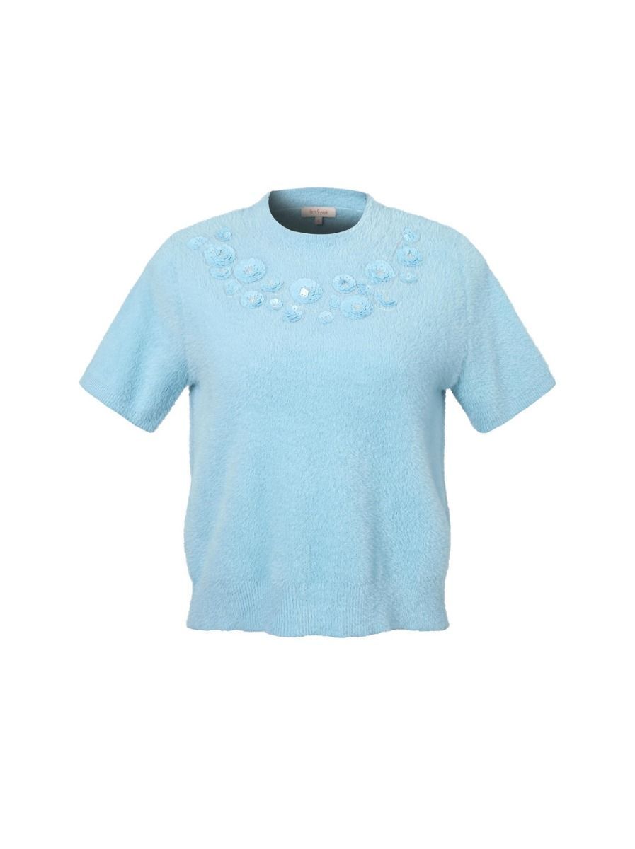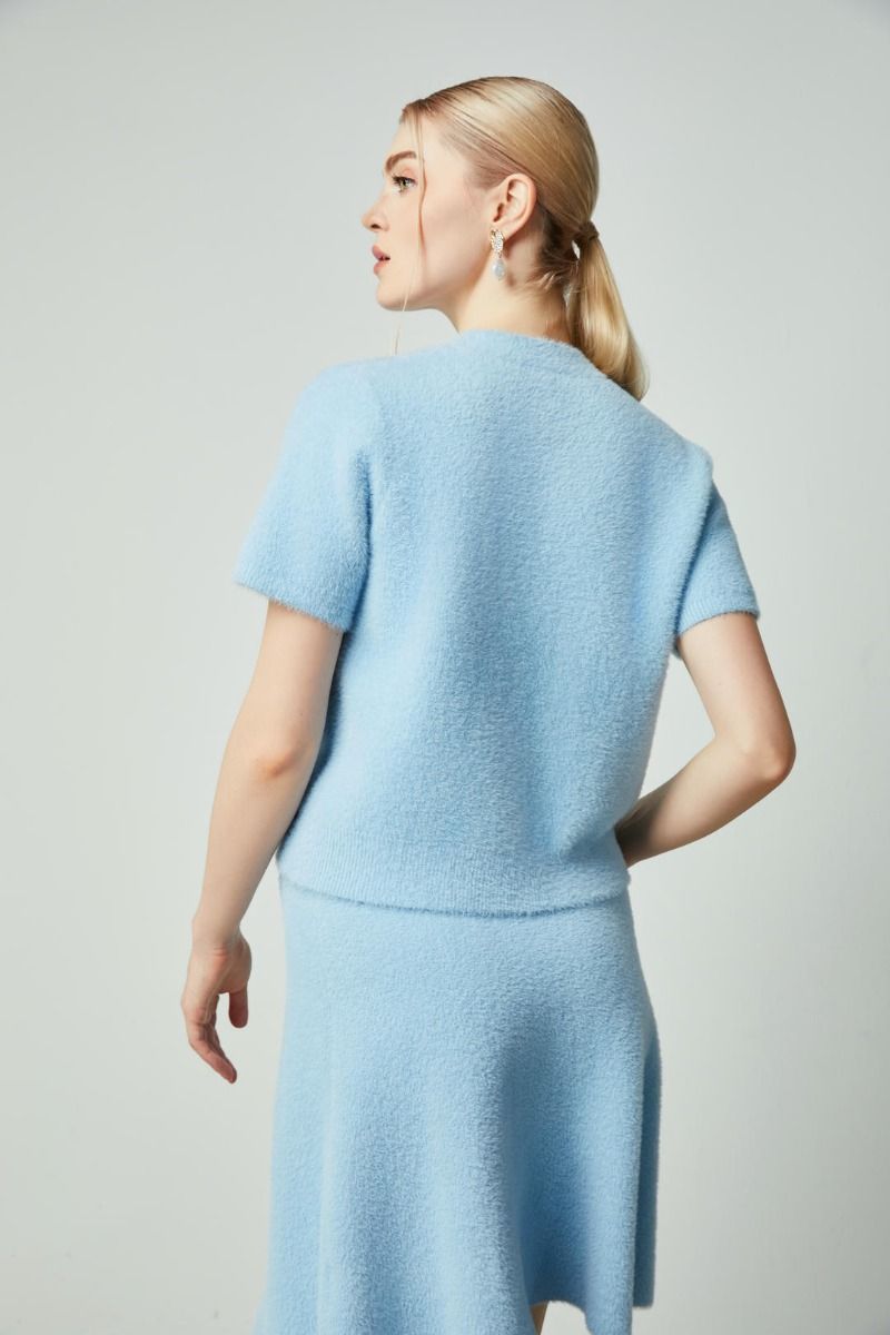تتميز هذه البلوزة المحبوكة بفتحة عنق دائرية وأكمام قصيرة، مع قصة ضيقة. يضفي الطول القصير لمسة عصرية، والزخارف المتناغمة حول العنق الأمامي تفاصيل أنيقة. نسقيها بشكل مثالي مع تنورة مشابها.