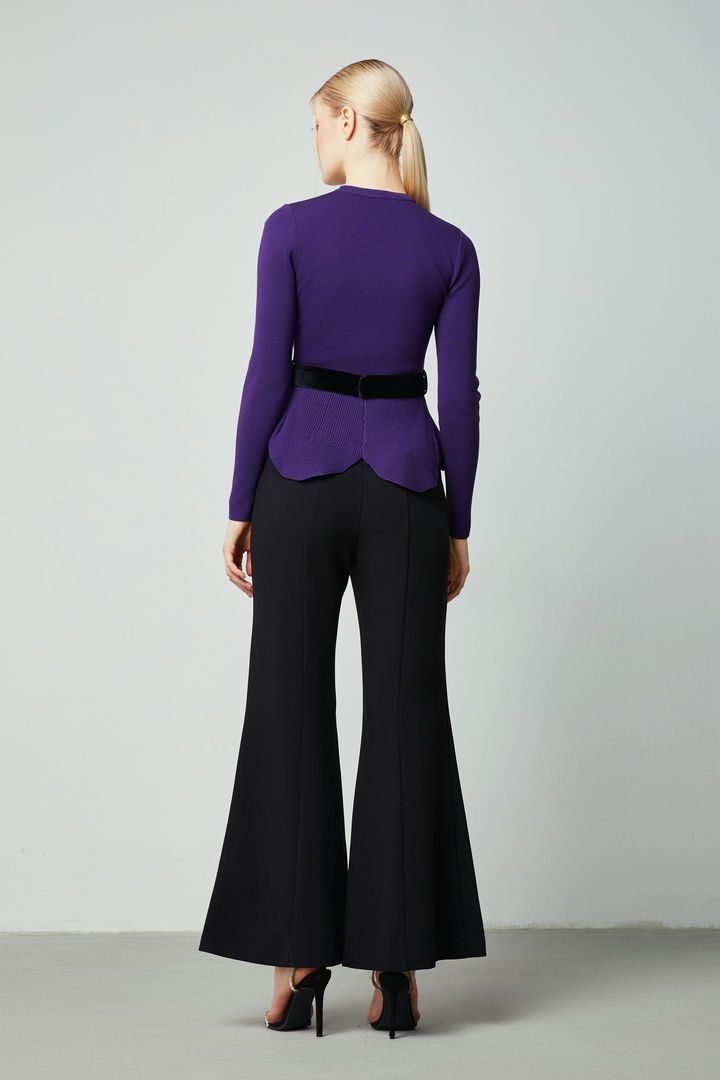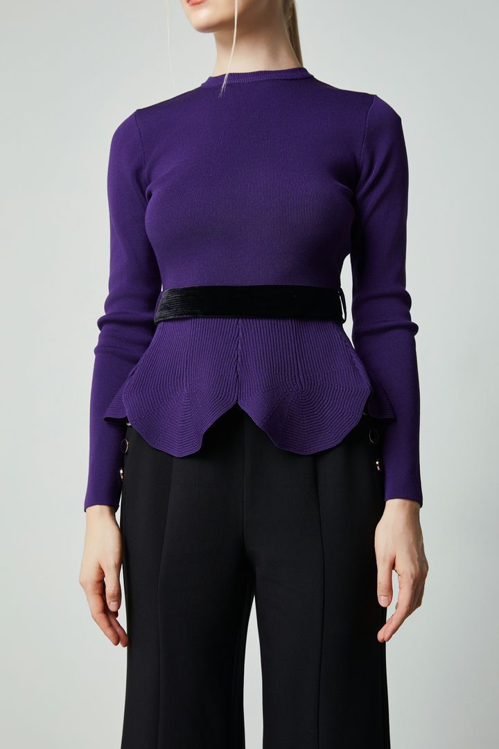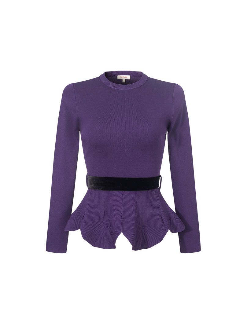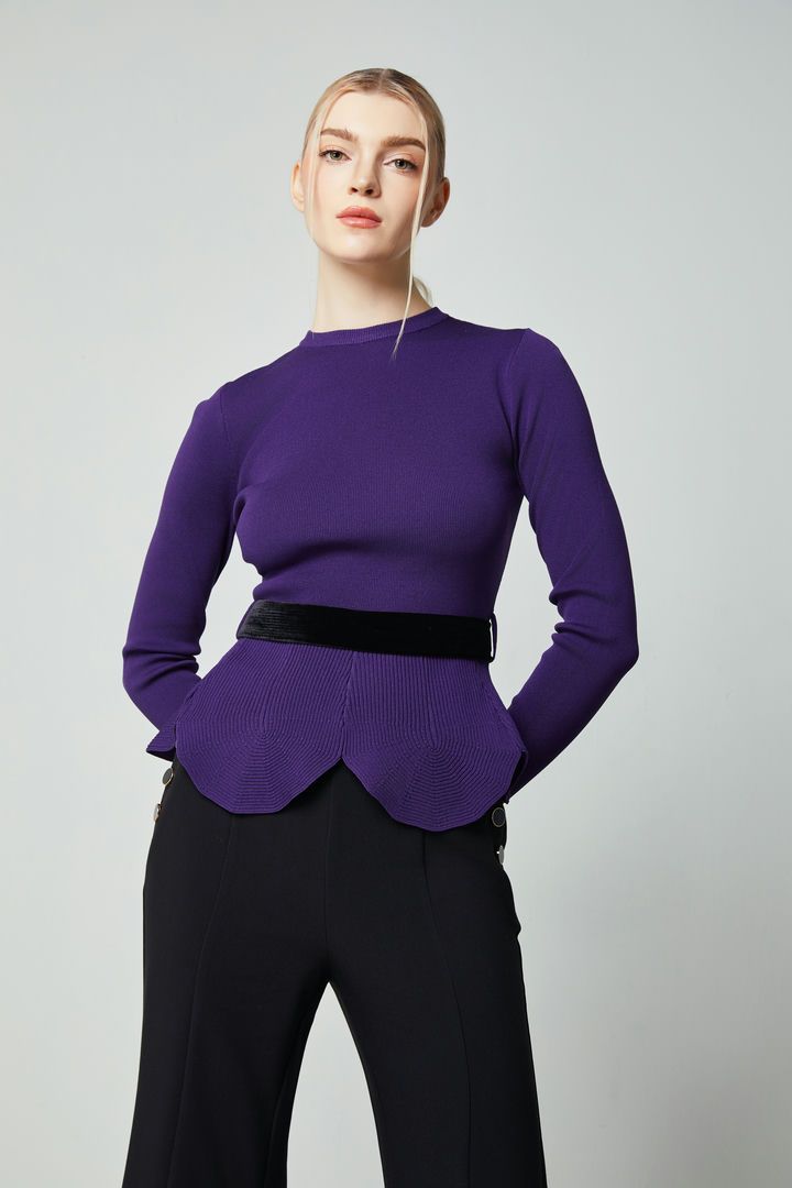 بلوفر أنيق بفتحة عنق دائرية وأكمام طويلة ضيقة، يتميز بحافة بيبلم وحزام من المخمل لإطلالة راقية.
