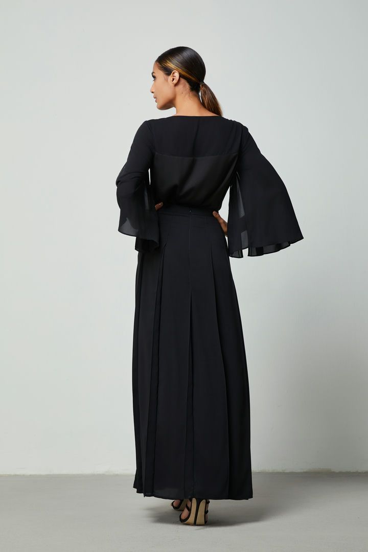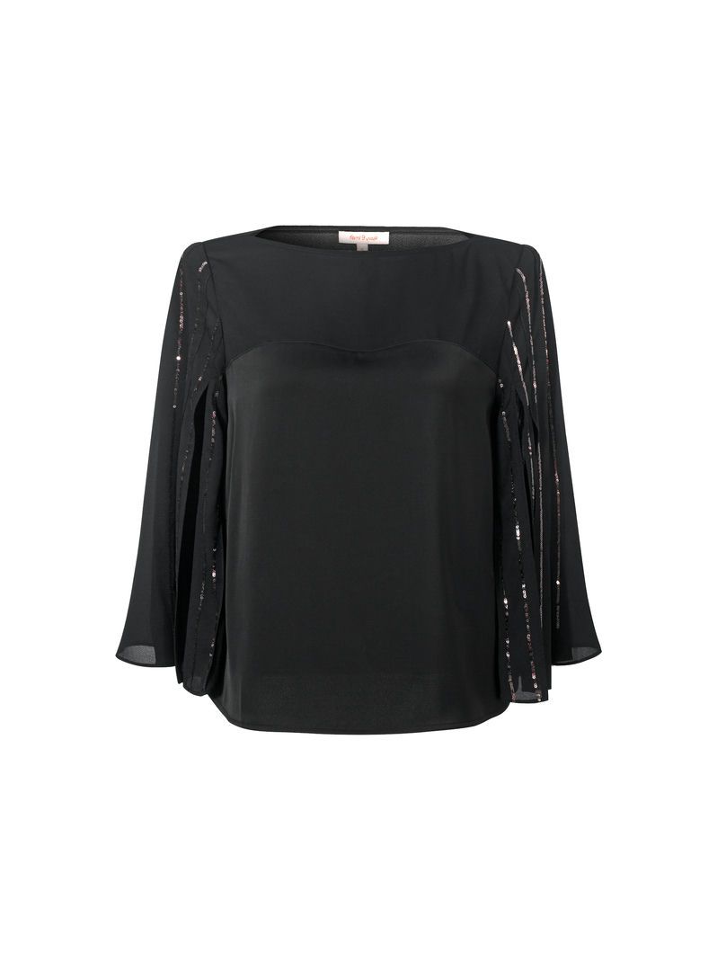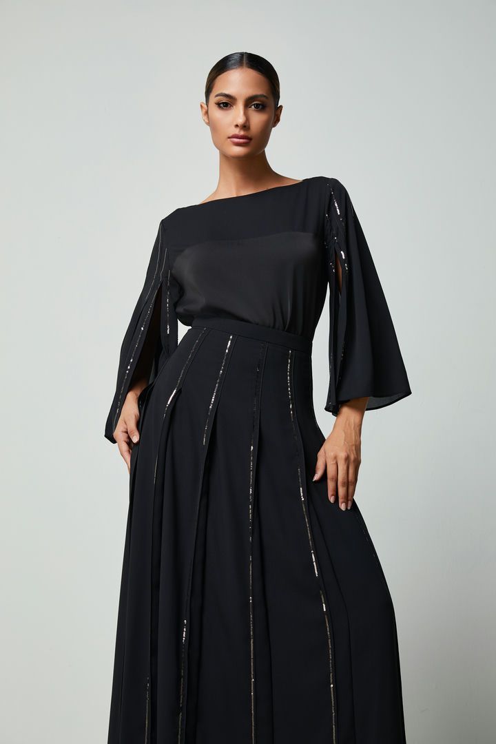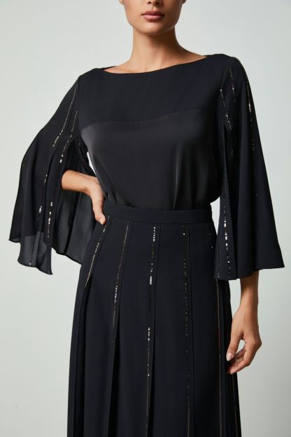 بلوزة أنيقة من الساتان غير اللامع بقصة واسعة وفتحة عنق دائرية. تتميز بأكمام متوسطة الطول من الشيفون بطيات مزينة بترتر لامع. نسقيها مع تنورة مشابهةلإطلالة متكاملة.